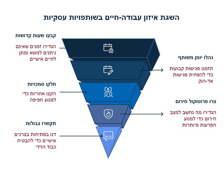 קבעו פגישות קבועות לדיונים חשובים. כשיש מסגרת ברורה, פחות דברים "דחופים" צצים בשעות לא שעות.